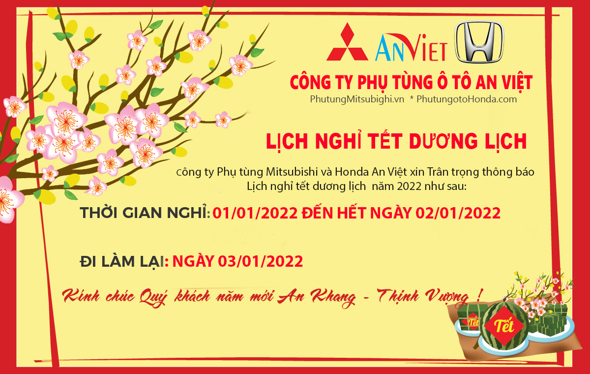 Công ty Phụ tùng ô tô Honda An Việt xin trân trọng thông báo lịch nghỉ tết Dương lịch năm 2022 như sau: